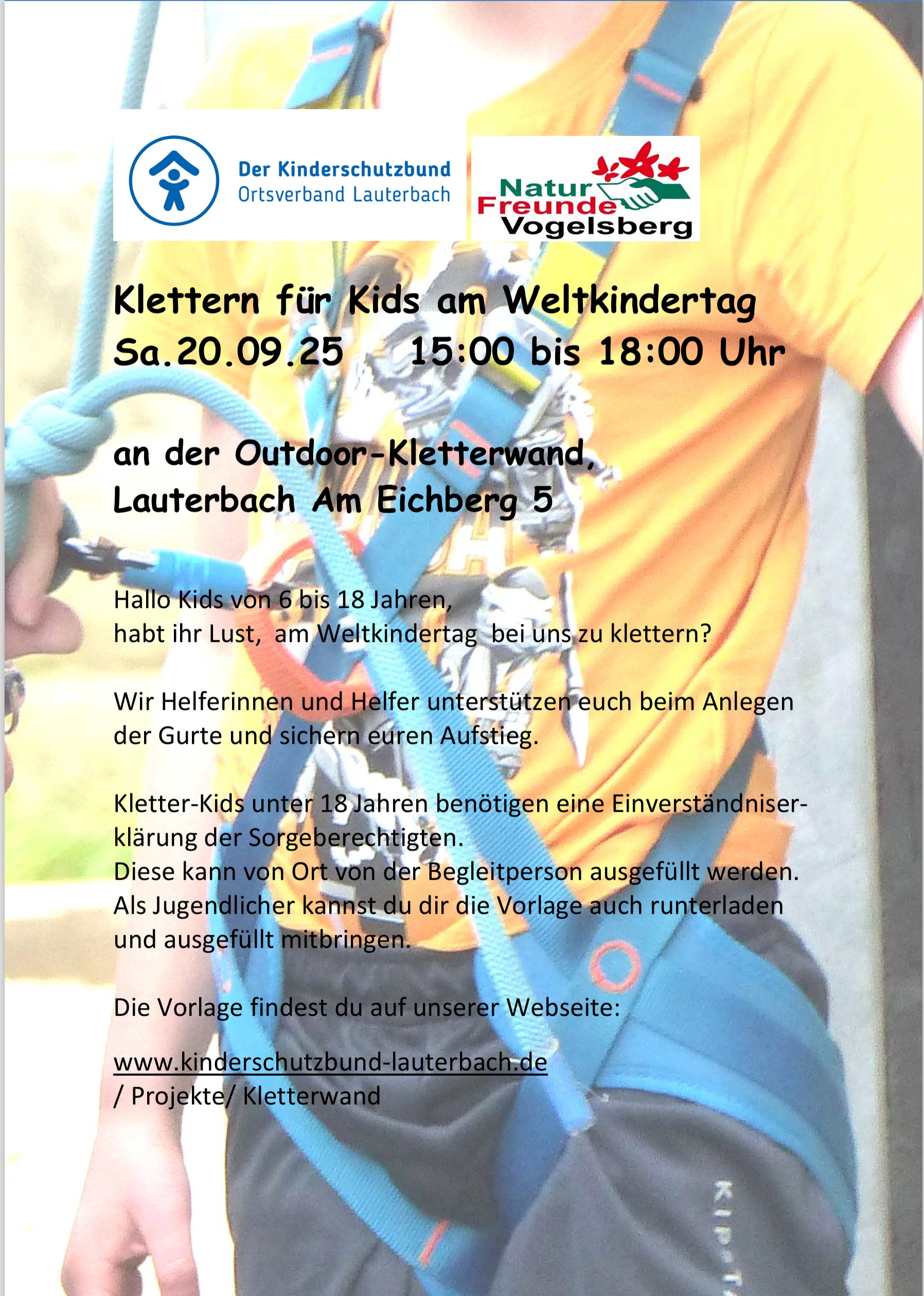 Anlässlich des Weltkindertages am 20.09.2025 laden der Kinderschutzbund Lauterbach und die Naturfreunde Vogelsberg Kinder und Jugendliche zum Klettern nach Lauterbach ein. Gemäß der Rechte der Kinder und Jugendlichen versprechen wir einen spannenden Nachmittag unter dem Motto „Du hast das Recht zu spielen, dich zu erholen und krativ zu sein“.